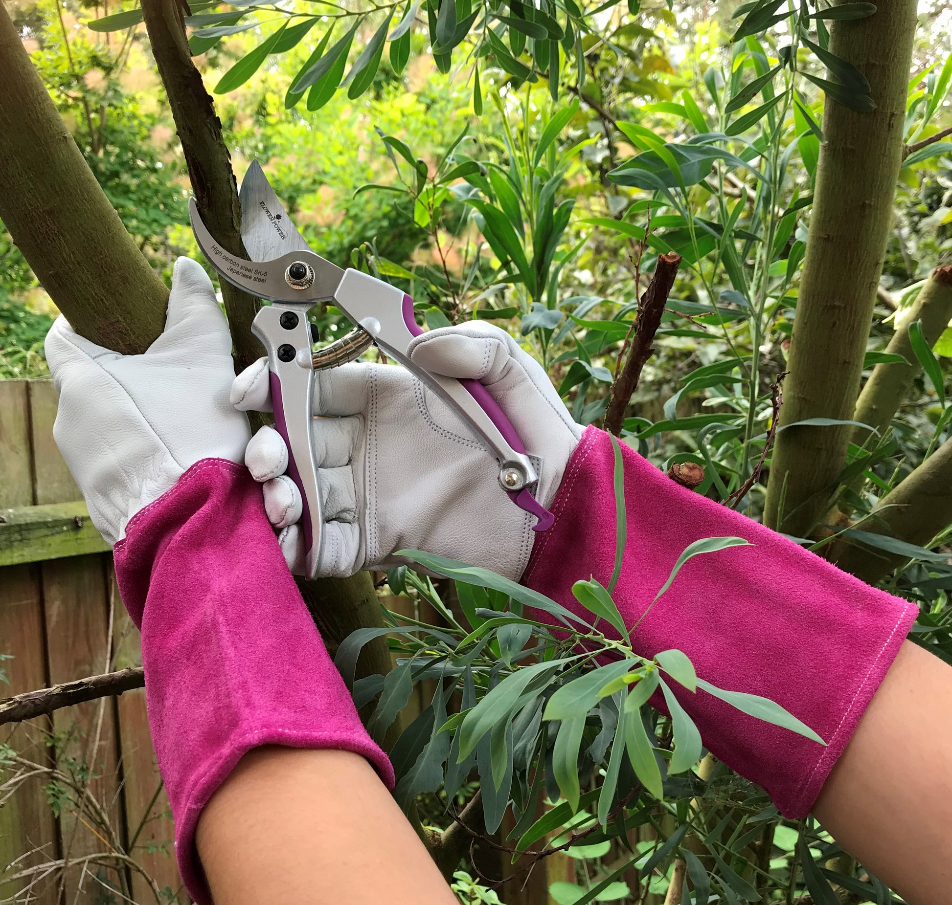 Premier Long Sleeve Gardening Gloves - These premier quality gloves are made from top quality goatskin leather and have a thick cowhide leather gauntlet. They are designed to make light and safe work of all your thorny tasks. Protect your hands and arms from scratches and punctures with these stylish gauntlet gloves. Made in 3 sizes these gloves are the perfect fit for any woman’s hands. The fingertips and palm have a double layer of goatskin for added protection and the long gauntlet cow hide cuffs are approximately 16cm long. They are stylish, comfortable, and perfect for trimming and cutting hedges, pruning roses, blackberry bushes and thistles whilst being soft enough to allow for dexterity for other more delicate garden tasks such as seeding and weeding.